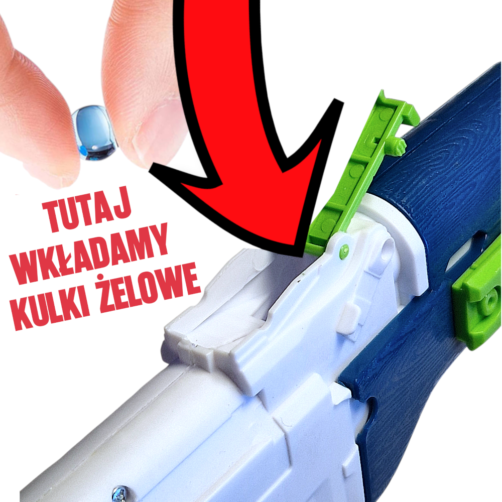 2. KULKI ŻELOWE (7-8mm) Gotowe kulki wsypuje się do specjalnego otworu na górze karabinu. Są w pełni biodegradowalne, bezpieczne i nie brudzą ubrań – po wyschnięciu znikają!