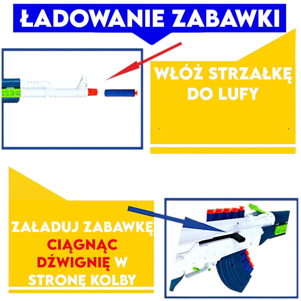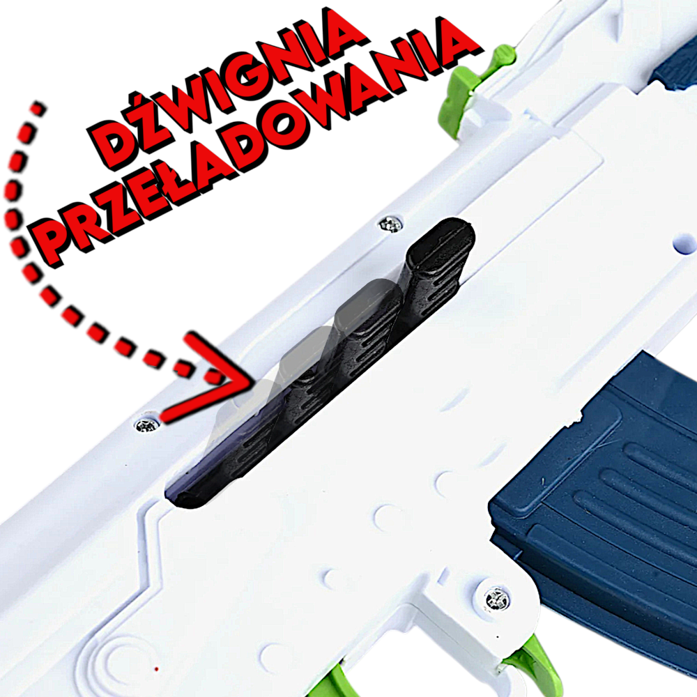 ✅ Zarówno w przypadku strzałek jak i kulek żelowych przeładowania dokonujemy pociągnięciem dźwignią w stronę kolby co naciąga mechanizm wyrzutni, przygotowując ją do strzału, który zwiększa frajdę z zabawy i daje wrażenie obsługi prawdziwego karabinu.